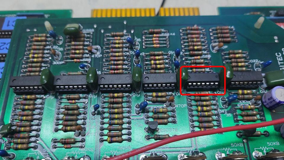 Wie zu erwarten, hatte sich einer der LM3900 verabschiedet. Da die LM3900 auf dem Soundboard alle gesockelt sind, und ich kein Schaltbild habe, habe ich einfach stumpf die LM3900 durchgetauscht, bis der Sound wieder da war.