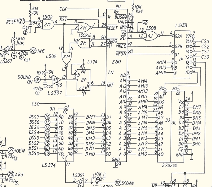 aber die untersuchung des soundsystems der pcb zeigt ein durchaus komplexes zusammenspiel von Z80 CPU, AY38910, I8039 MCU und filterstufen.